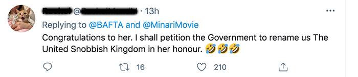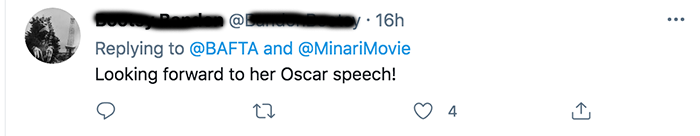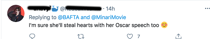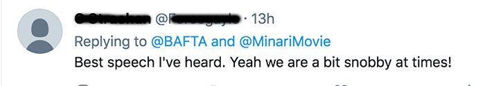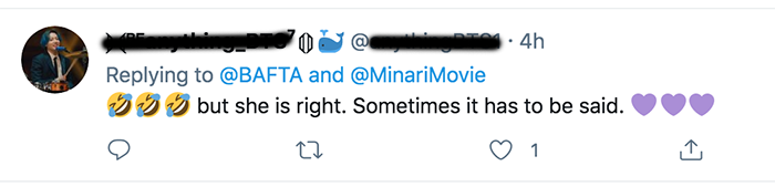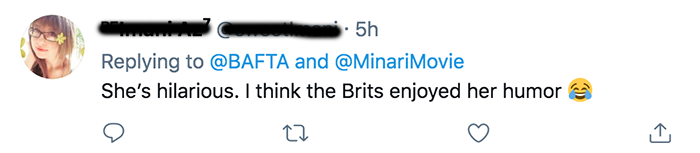 BAFTA 공식 트위터 반응을 보면 영국인들을 포함해서 많은 사람들이 그녀의 수상 소감에 정말 재미있어하고 있네요.
