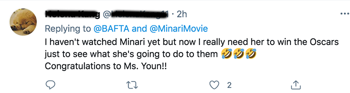 나는 아직 미나리는 안 봤어. 그런데 정말로 그녀가 오스카상을 받았으면 좋겠어. 그녀의 수상소감이 너무 기대되거든 하하하