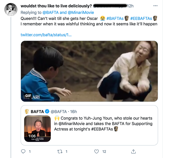 "미나리에서 우리의 마음을 사로잡은 윤여정이 오늘 밤 BAFTA 여우조연상을 수상한 것을 축하합니다."